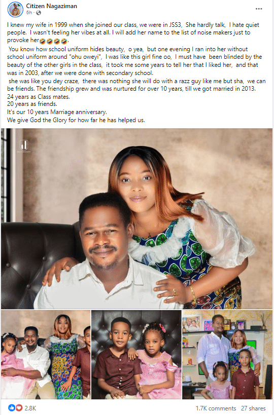 A Nigerian man has shared his journey from playfully pranking his JSS3 classmate by adding her name to the noisemakers’ list to enjoying ten years of happily married life with her.
