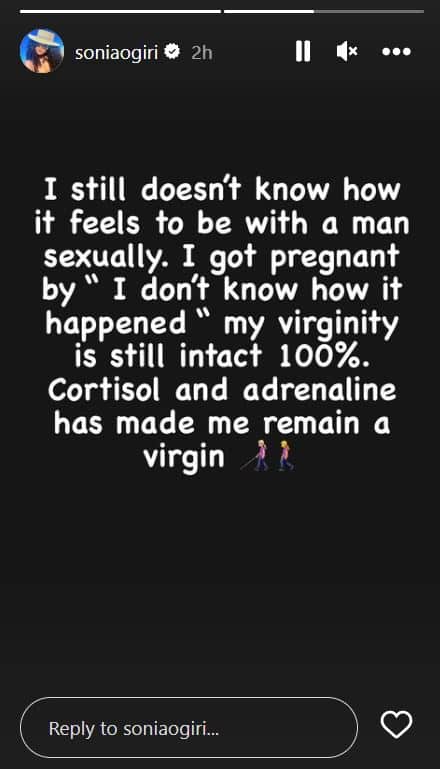 “I still don’t know how it feels to be with a man sexually. I got pregnant because ‘I don’t know how it happened,’ and my virginity is still intact 100%. Cortisol and adrenaline have made me remain a virgin,” she wrote.
