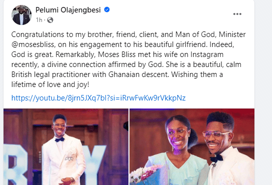 “Congratulations to my brother, friend, client, and Man of God, Minister @mosesbliss, on his engagement to his beautiful girlfriend.