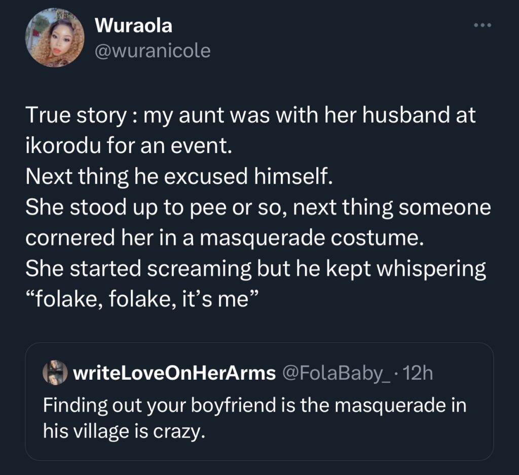 An X user, @FolaBaby_, had made a tweet saying, “how it would be crazy to discover that your boyfriend is the village masquerade”, to which Wura responded, explaining how her aunt came to this unfortunate realization that her husband is a masquerade.