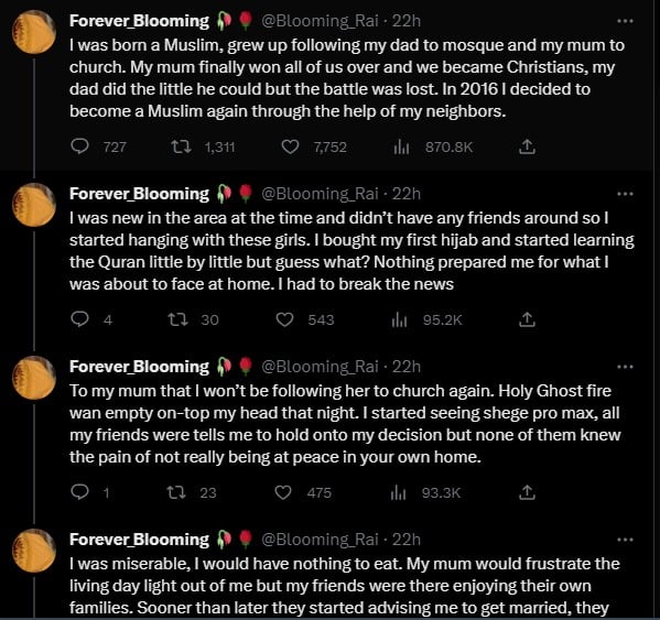 A Twitter user identified as @Blooming_Rai took to the platform to share the religious journey of converting from being a Christian to Muslim.