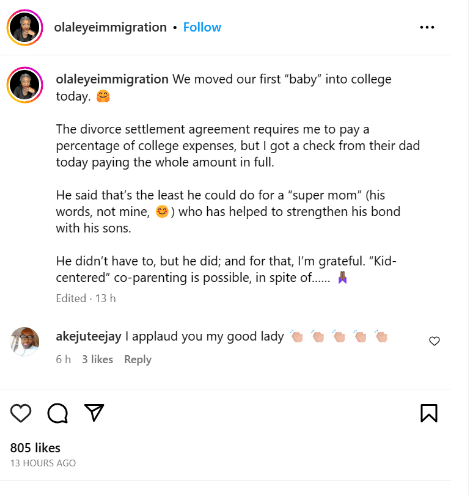 Abisola Olaleye, a Nigerian woman based in the United States, has recounted a heartwarming story of her ex-husband’s gratitude towards her for being a ‘super mom’, underscoring their unwavering commitment to prioritizing their children’s well-being even in the aftermath of their divorce
