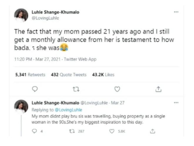 A lady identified as Loving Luhle on Twitter has revealed how her mother who died 21 years ago, still pays her a monthly allowance.