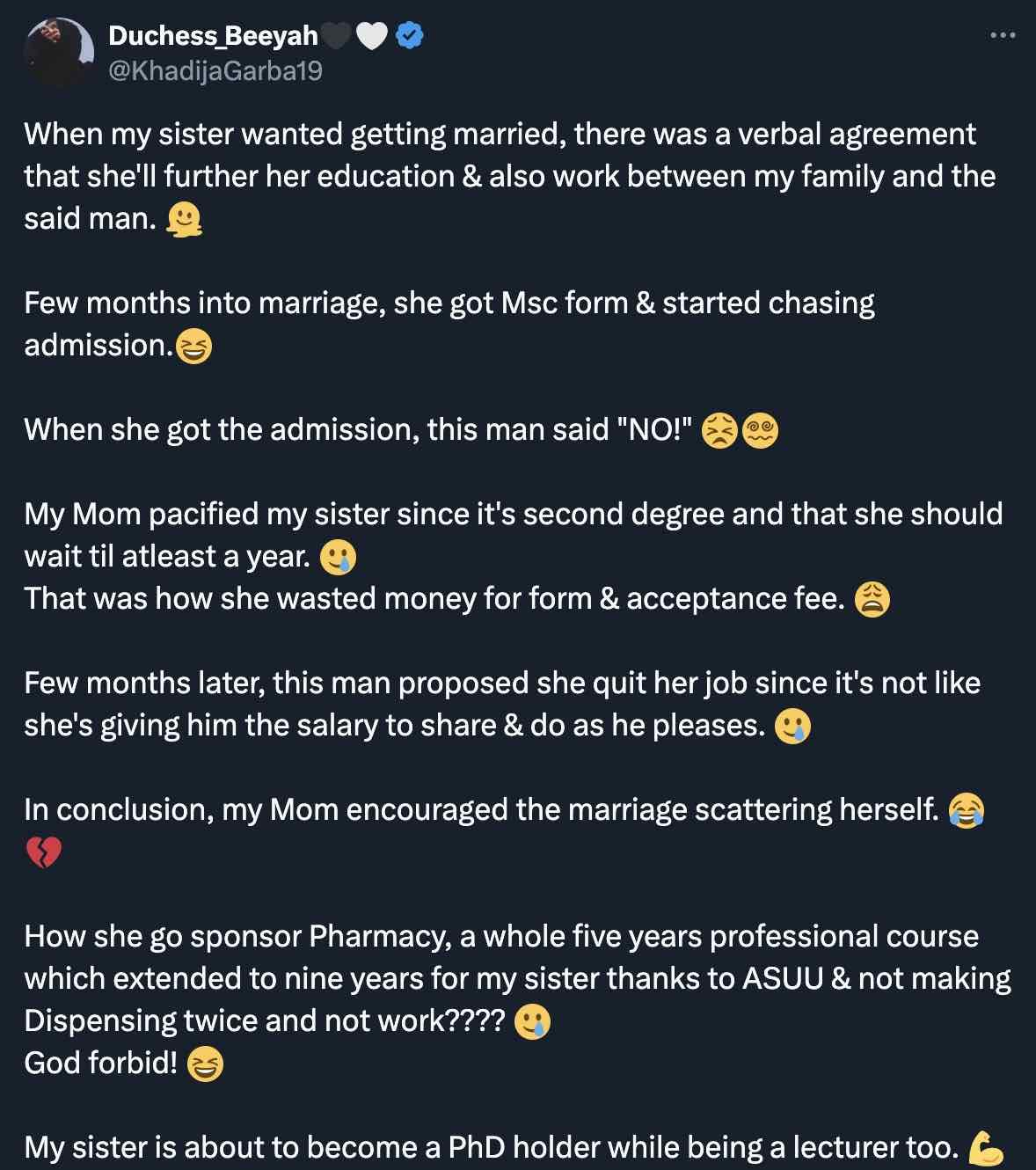 “When my sister wanted getting married, there was a verbal agreement that she’ll further her education & also work between my family and the said man. 🫠
