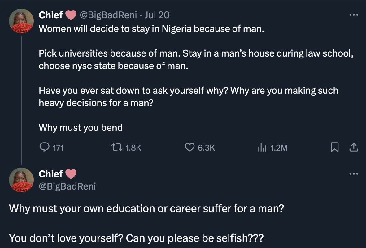“Women will decide to stay in Nigeria because of man. Pick universities because of man. Stay in a man’s house during law school, choose nysc state because of man.