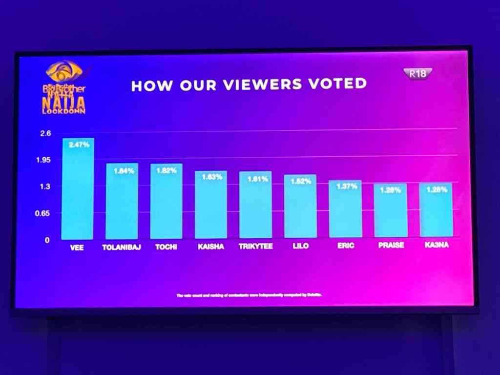 According to result posted after the show, the bottom 9 housemates comprise of Vee, Tolanibaj, Tochi, Kaisha, Trikytee, Lilo, Eric, Praise and Ka3na.