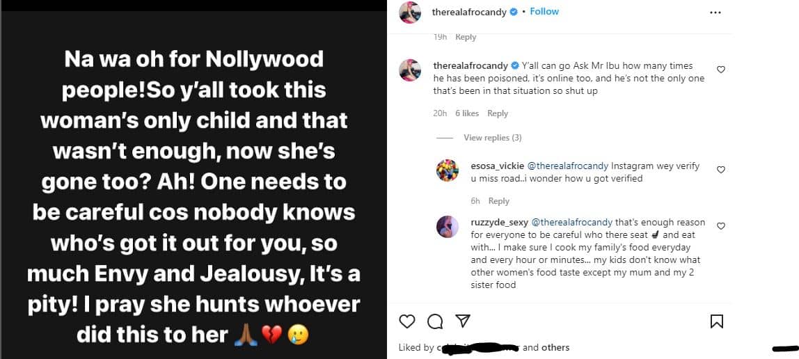Afrocandy in a post she shared via her Instagram page claimed that ‘Nollywood people’ are behind the death of the thespian and her daughter. She added that they have also made several attempts on Mr Ibu’s life.