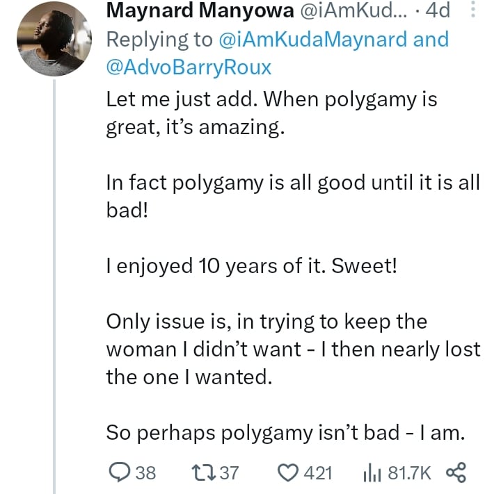 A journalist by the name Maynard Manyowa has narrated how becoming a polygamist became the biggest mistake he regrets making.