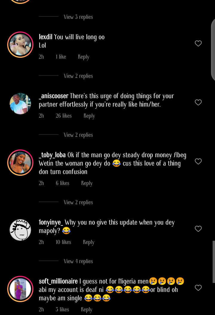 “Ok if the man go dey steady drop money fibeg Wetin the woman go dey do & cus this love of a thing don turn confusion “