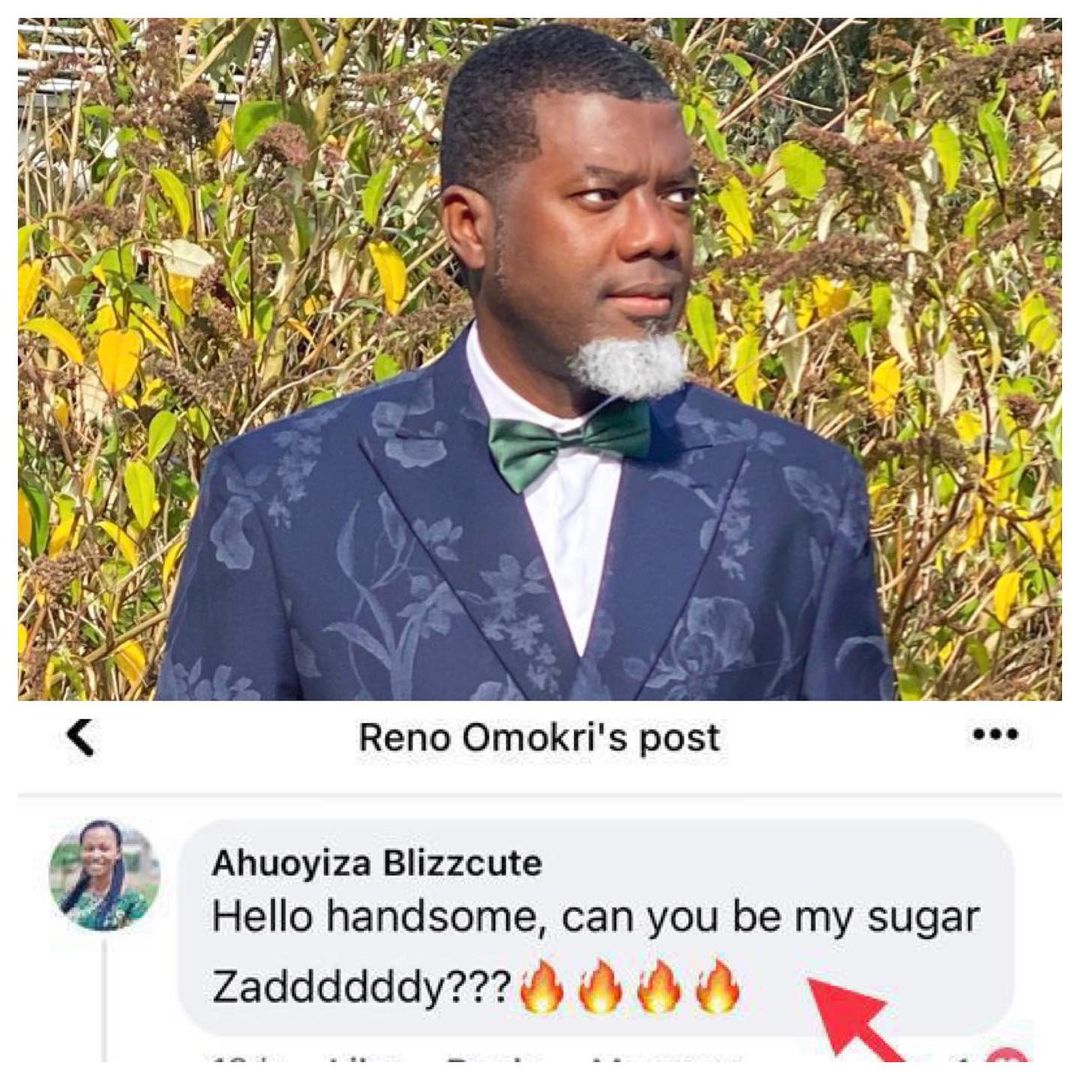 The lady who goes by the name Ahouyiza Blizzcute on Facebook, commented under a recent post by Reno Omokri on Tuesday, and asked him if he will be her “Sugar Daddy”.