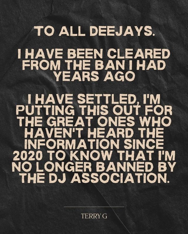 “To all deejays. I have been cleared from the ban I had years ago I have settled. I’m putting this out for the great ones who haven’t heard the information since 2020 to know that I’m no longer banned by the DJ association. Terry G,” he added.