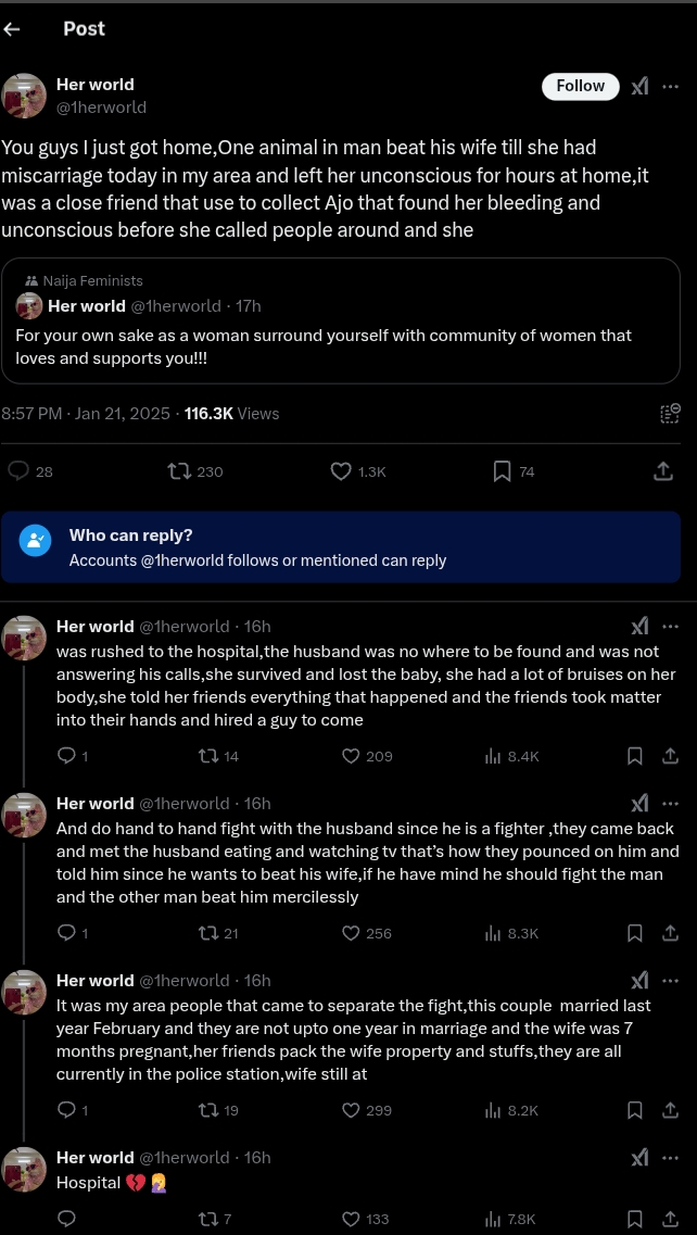 “You guys, I just got home. One animal in human form beat his wife till she had a miscarriage today in my area and left her unconscious for hours at home. It was a close friend who collects ajo that found her bleeding and unconscious.”