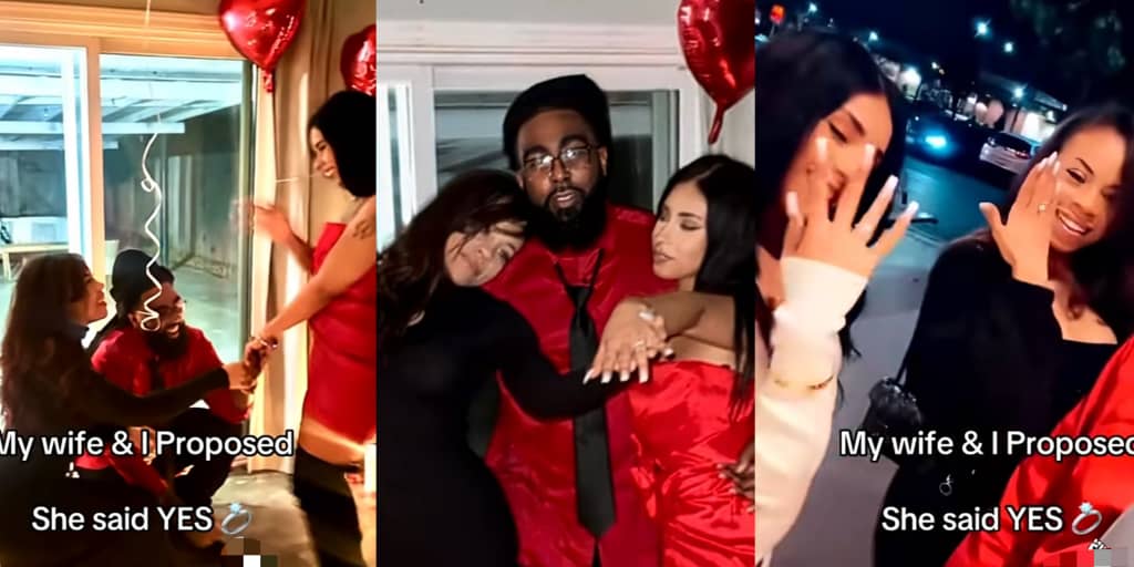 A husband and his wife have gone viral online after both of them got down on one knee to propose marriage to his girlfriend.