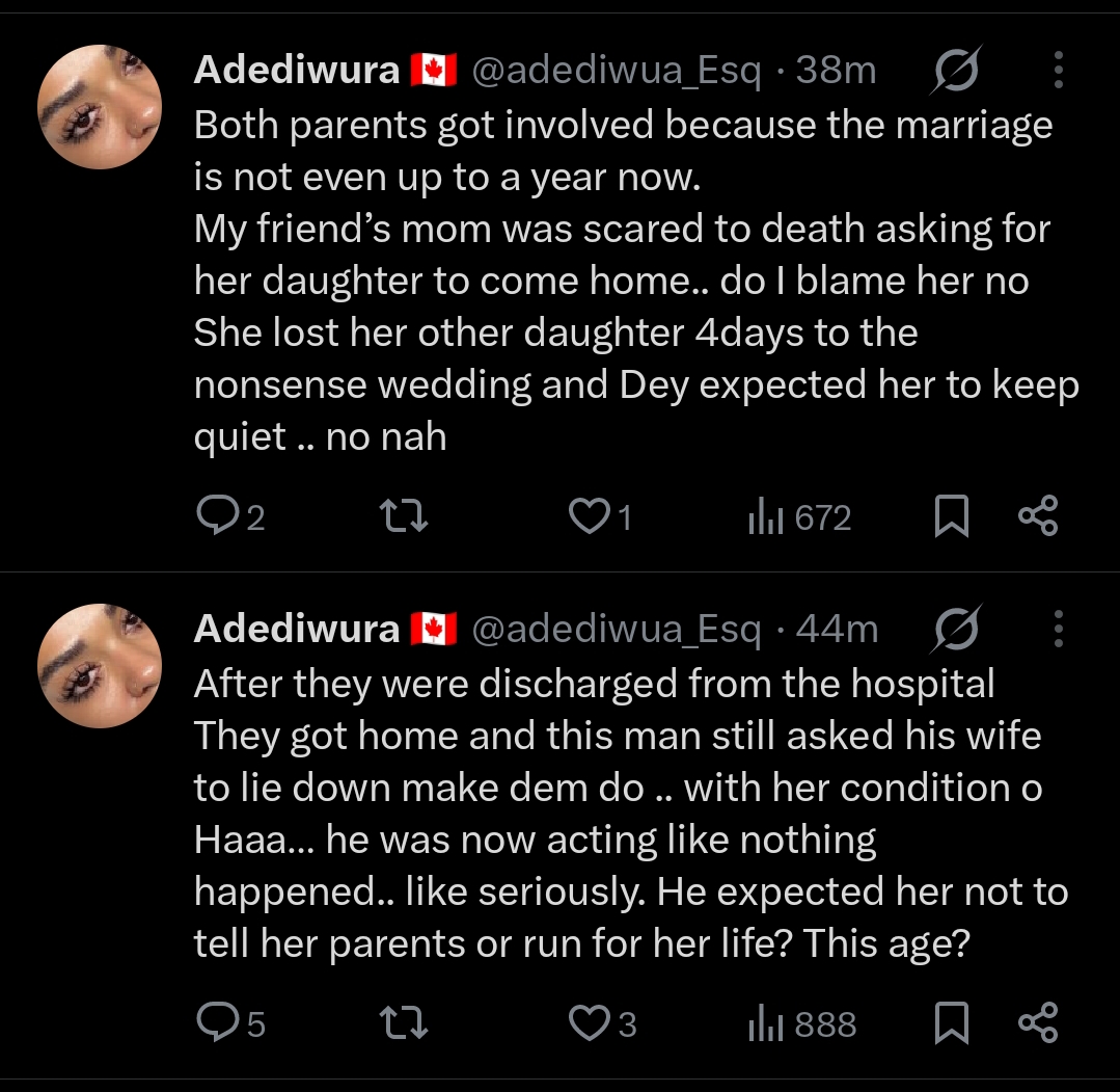 “After being discharged, they returned home and he still asked her to lie down for sex. With her condition. And he acted like nothing happened. Her parents got involved. Her mom had just lost another daughter four days before the wedding. Now this?”