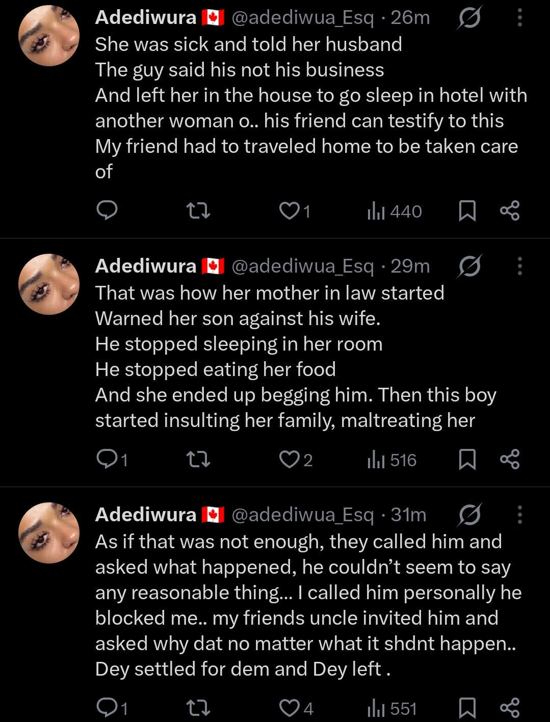 According to her account, the woman’s friend, who has been married for less than a year, has been repeatedly subjected to domestic violence, emotional trauma, and constant infidelity from her husband including with his baby mama.