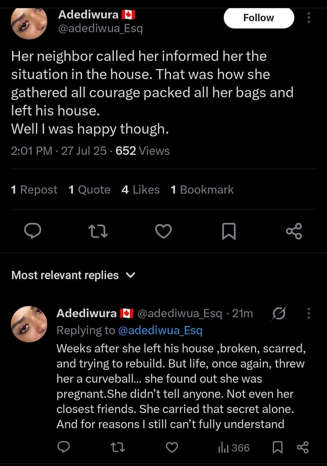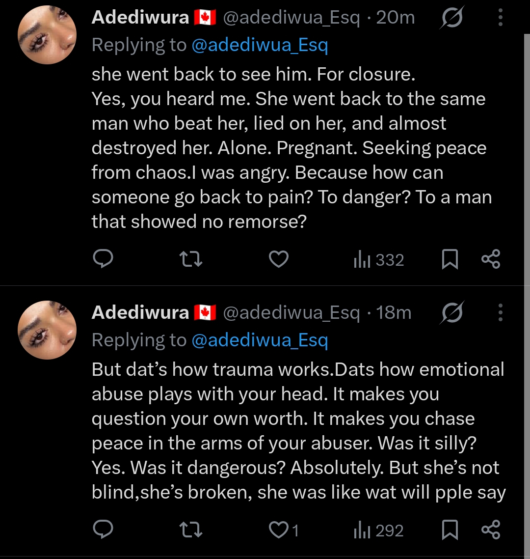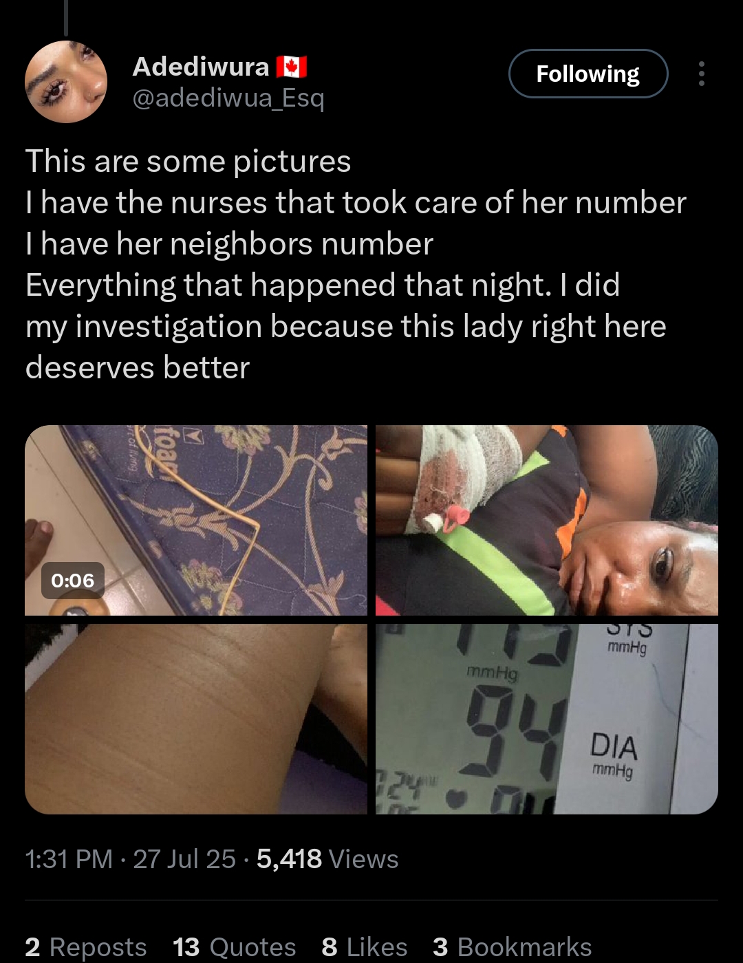 Dis time with a pregnancy.Dragged her by her hair across the floor like she was nothing. It was the neighbors that saved her that day. They pulled him off her.That’s how far it had gone pic.twitter.com/sdqHgnQ55z— Adediwura 🇨🇦 (@adediwua_Esq) July 27, 2025