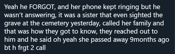 “Yeah he FORGOT, and her phone kept ringing but he wasn’t answering, it was a sister that even sighted the grave at the cemetery yesterday, called her family and that was how they got to know, they reached out to him and he said oh yeah she passed away 9months ago bt h frgt 2 call.