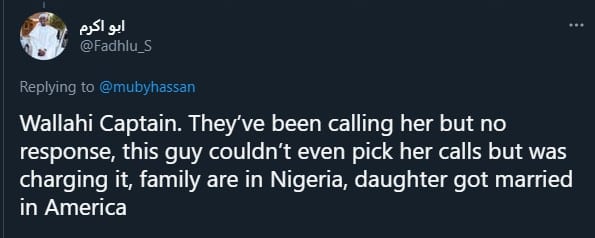 “Wallahi Captain. They’ve been calling her but no response, this guy couldn’t even pick her calls but was charging it, family are in Nigeria, daughter got married in America,” the user wrote.