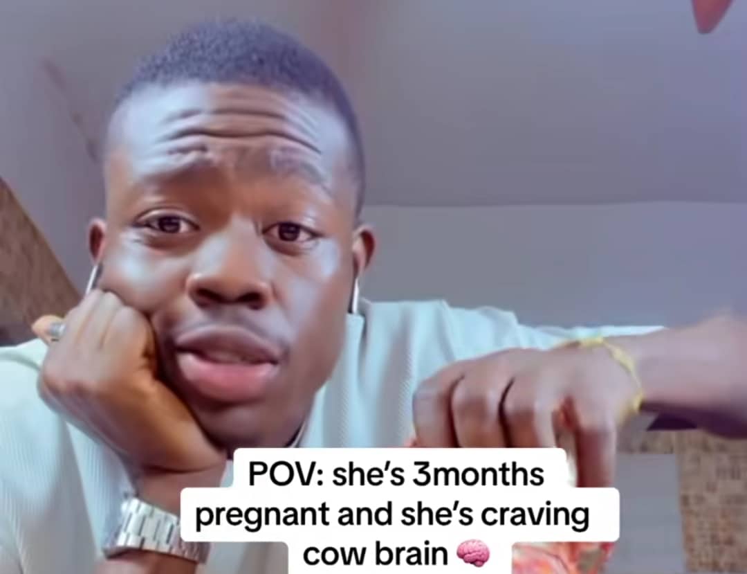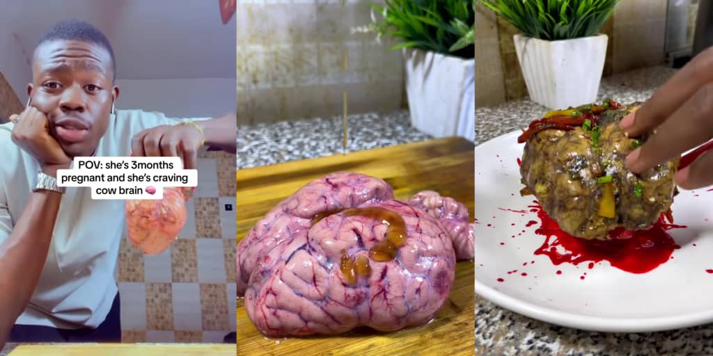 A pregnant wife triggers ggers reactions as she makes her husband cook cow brain after she craves it; video goes viral online.