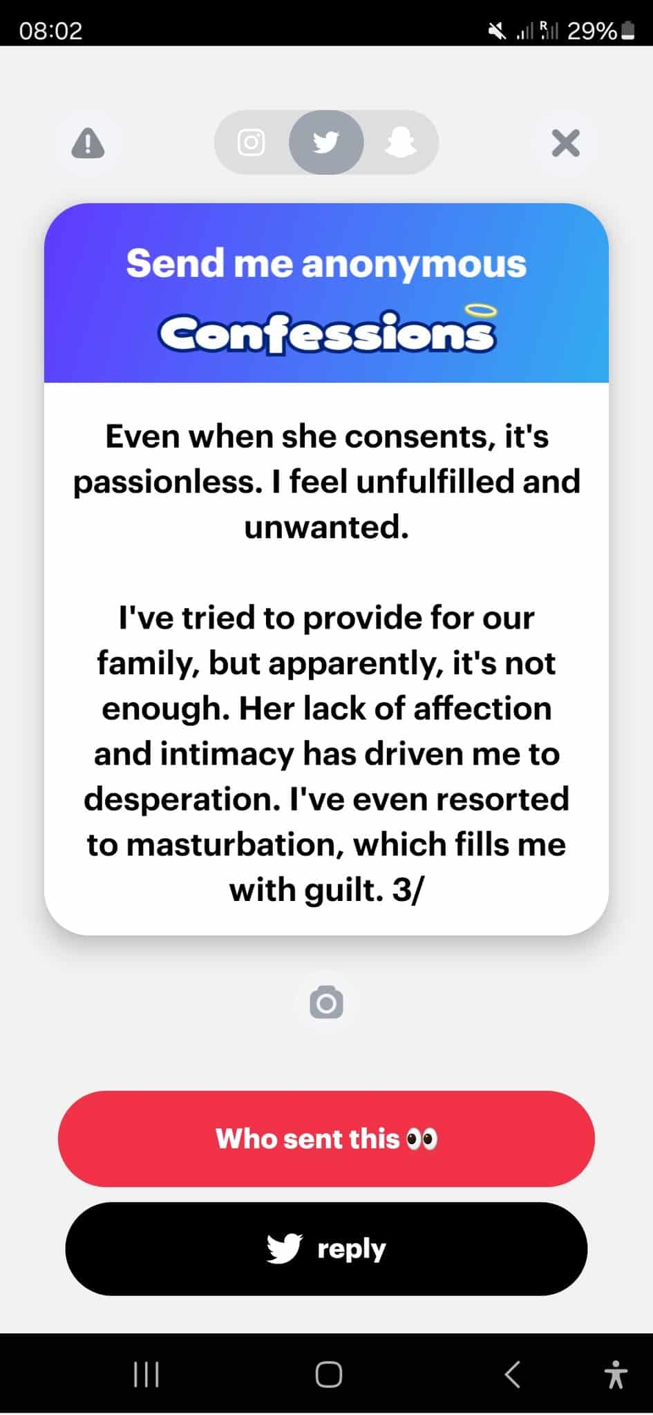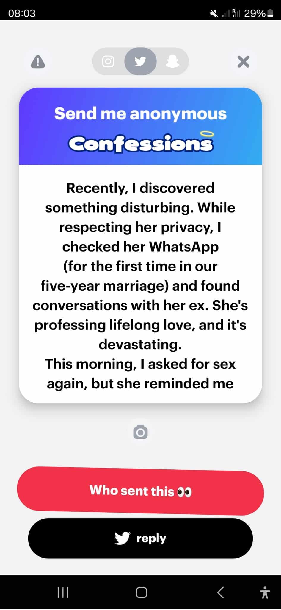 “I’ve tried to provide for our family, but apparently, it’s not enough. Her lack of affection and intimacy has driven me to desperation. I’ve even resorted to masturbation, which fills me with guilt. Recently, I discovered something disturbing. While respecting her privacy, I checked her WhatsApp (for the first time in our five-year marriage) and found conversations with her ex. She’s professing lifelong love, and it’s devastating.”