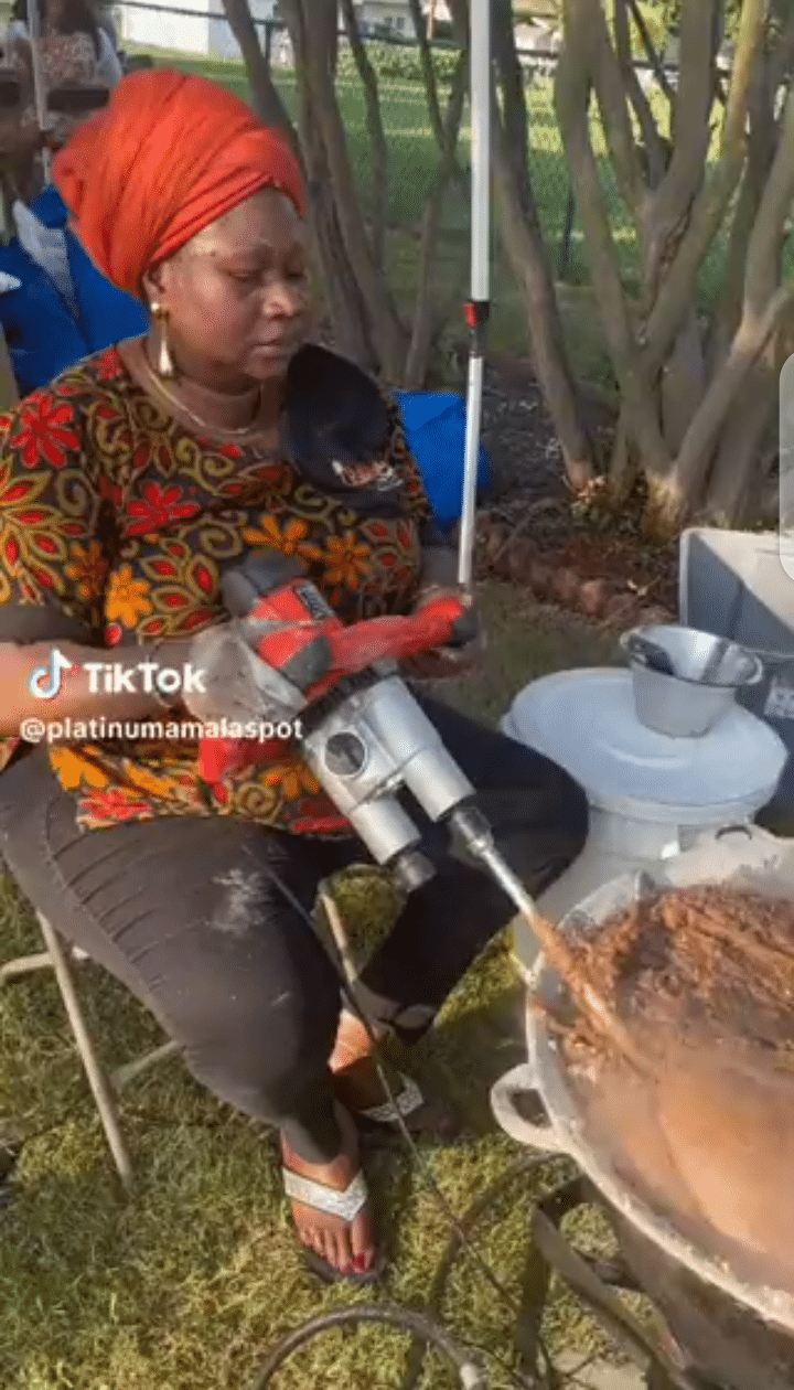 In the intriguing footage, the woman was seen holding a machine with a long handle, cleverly positioned inside a pot to stir the Amala to perfection.