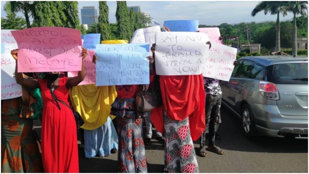 Some Protesters on Monday took to the US Embassy, Abuja, demanding an investigation into the link between ex-Vice President, Atiku Abubakar, Timi Frank, Dino Melaye and some Peoples Democratic Party (PDP) chieftains with Raymond Abbas Igbalode, popularly known as Hushpuppi.