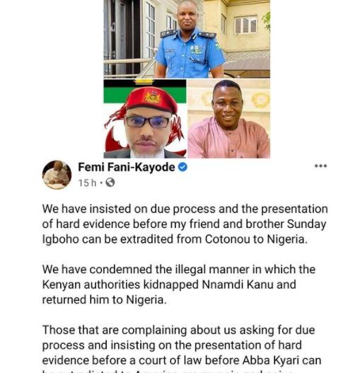 In a post shared, FFK opined that if people asked for due processes during the time of Sunday Igboho and Nnamdi Kanu, then the same people should keep the exact energy and follow the due process in Abba’s case.