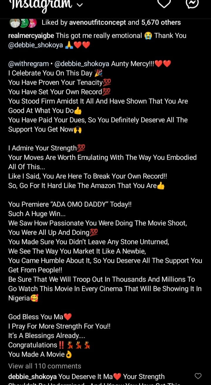 In response, Mercy Aigbe wrote: “This got me really emotional. Thank You @debbie_shokoya.”