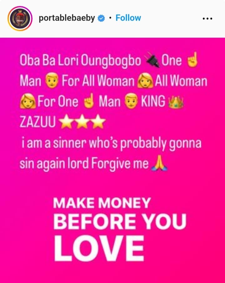 “Oba Ba Lori Oungbogbo. One Man For All Woman. All Woman For One Man KING 👑 ZAZUU. I am a sinner who’s probably gonna sin again lord Forgive me 🙏“, Portable wrote.