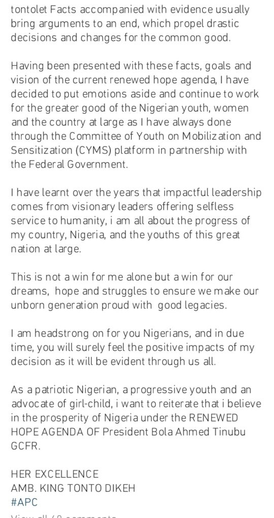 Having been presented with these facts, goals, and vision of the current renewed hope agenda, I have decided to put emotions aside and continue to work for the greater good of the Nigerian youth, women, and the country at large as I have always done through the Committee of Youth on Mobilization and Sensitization (CYMS) platform in partnership with the Federal Government.
