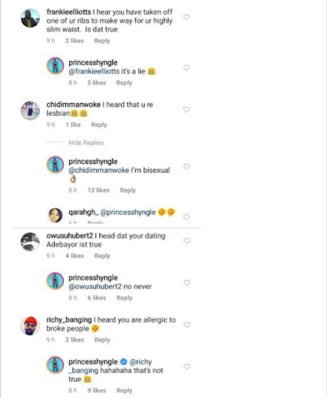 During her question and answer session on Instagram, princess Shyngle asked her fans to ask any question and she would respond if it is true or false.