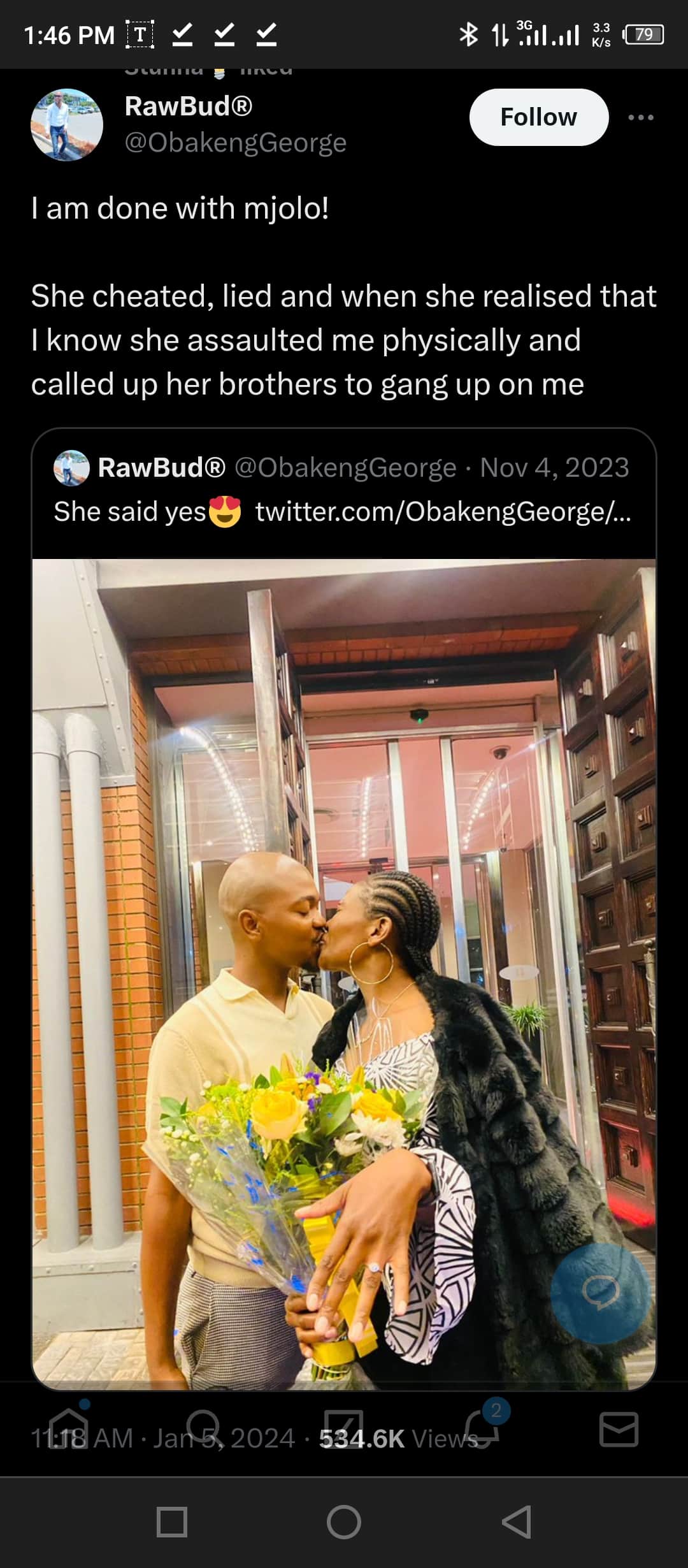 The man, @ObakengGeorge, revealed in a series of tweets on X (formerly Twitter) that his now ex-lover cheated on him, lied, and even resorted to physical assault by calling her brothers to gang up on him.