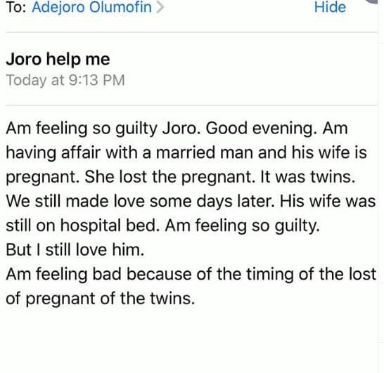 “Am feeling so guilty Joro. Good evening. Am having affair with a married man and his wife is pregnant. She lost the pregnant. It was twins. We still made love some days later. His wife was still on hospital bed. Am feeling so guilty. But I still love him. Am feeling bad because of the timing of the lost of pregnant of the twins.”