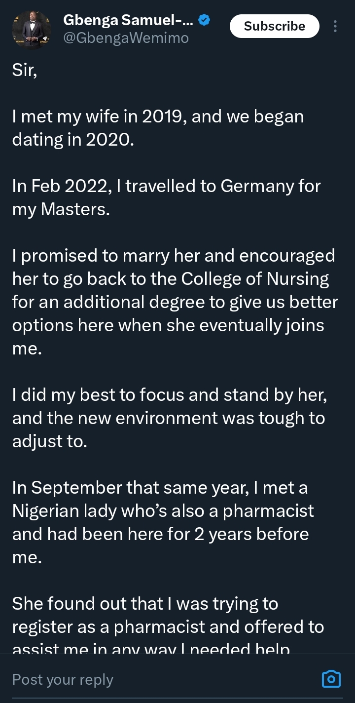 A Nigerian man has shared a detailed account of how a past relationship in Germany is now threatening his marriage, after his wife discovered a message from another woman on his phone.