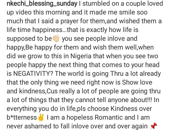“I stumbled on a couple loved up video this morning and it made me smile soo much that I said a prayer for them,and wished them a life time happiness…that is exactly how life is supposed tobe you see people inlove and happy,Be happy for them and wish them well,when did we grow to this in Nigeria that when you see two people happy the next thing that comes to your head is NEGATIVITY? The world is going Thru a lot already that the only thing we need right now is Show love and kindness,Cus really a lot of people are going thru a lot of things that they cannot tell anyone about!!! In everything you do in life,pls choose Kindness over b*tterness I am ahopeless Romantic and I am never ashamed to fall inlove over and over again”