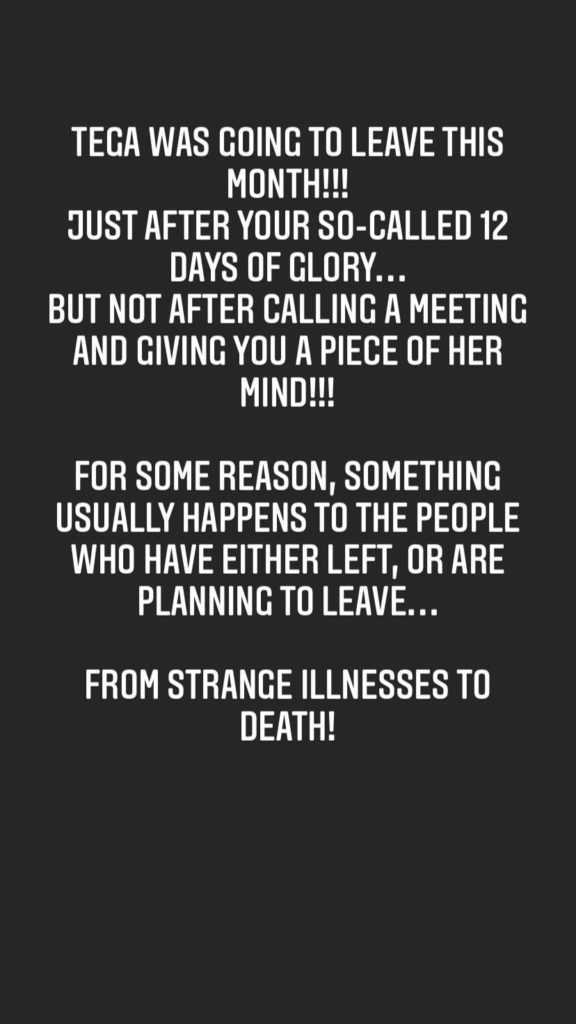 Tega was going to leave this month. For some reason, something happens to the people who have either left or are planning to leave. From strange illnesses to death. For everyone still serving there, I commit you to your maker”.