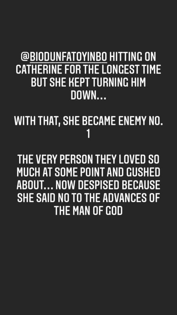 Hitting on Catherine for the longest time, and she kept turning him down. She became the enemy number one because she said No to the advances of the ‘man of God’.