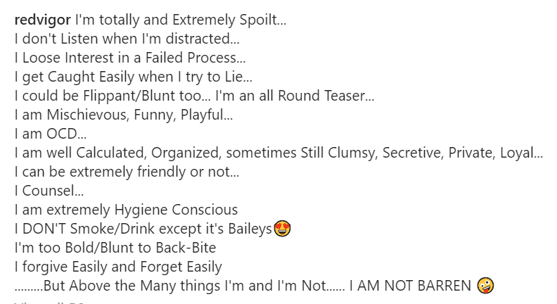 She has now set the record straight with a new Instagram post where she described herself and ended it by saying; “I AM NOT BARREN”