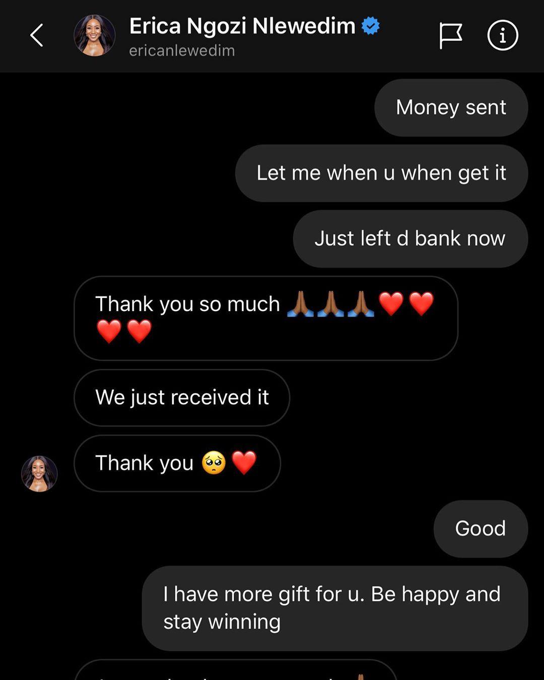 He also shared a screenshot of Erica’s team confirming they received the money.
