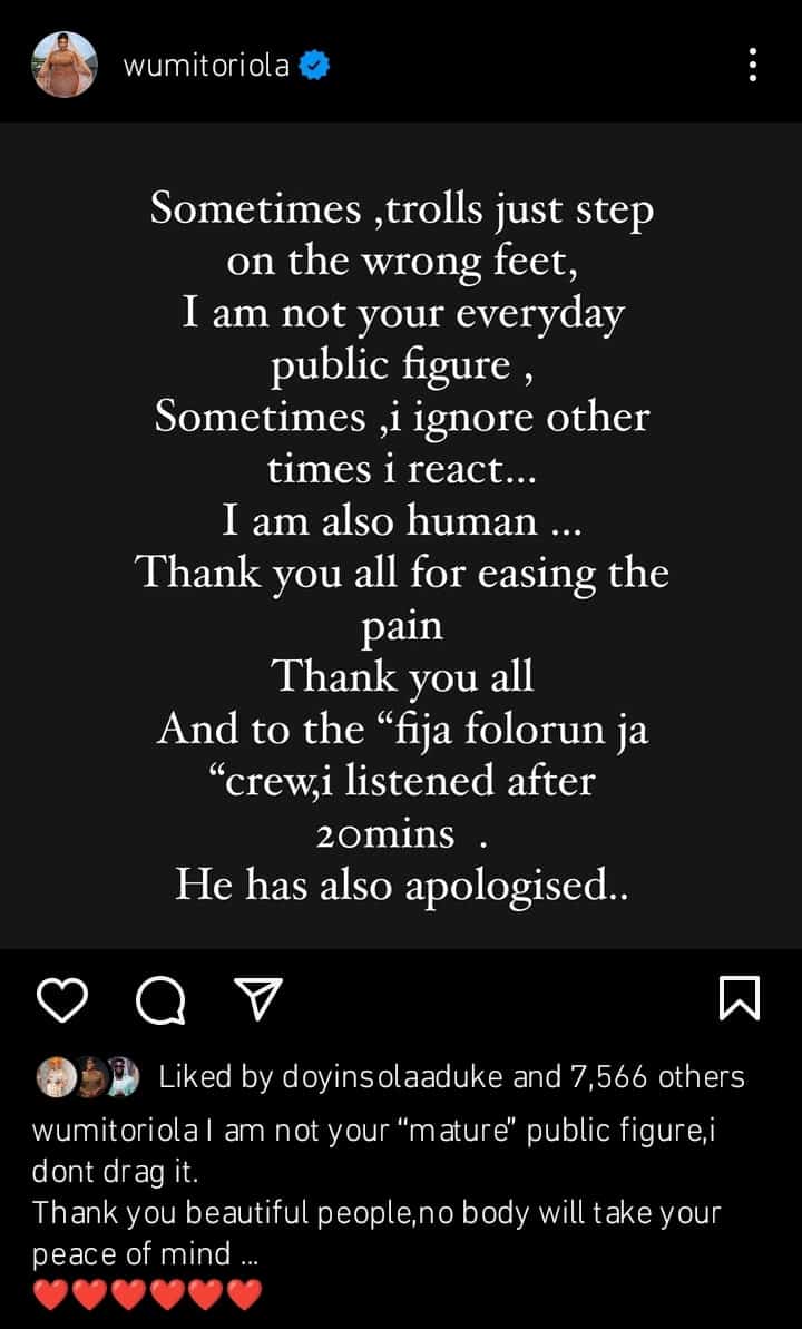 Her post read: “Sometimes, trolls just step on the wrong feet. I am not your everyday public figure. Sometimes, I ignore other times I react… I am also human. Thank you for easing the pain. Thank you all and to the “fija folorun ja crew. I listened after 20 minutes. He has also apologized.”