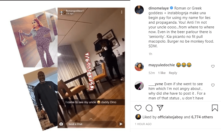 “Roman or Greek goddess + instablognja make una begin pay for using my name for lies and propaganda. You! Anti I’m not your uncle oooo…from where to where now. Even in the beer parlour there is ‘seniority’. Kia picanto no fit pull macopolo. Burger no be monkey food. SDM.” he wrote.