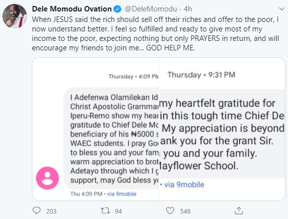 Chief Dele Momodu has disclosed that he will give most of his earnings to the poor. He shared proof to show he has started doing that already.