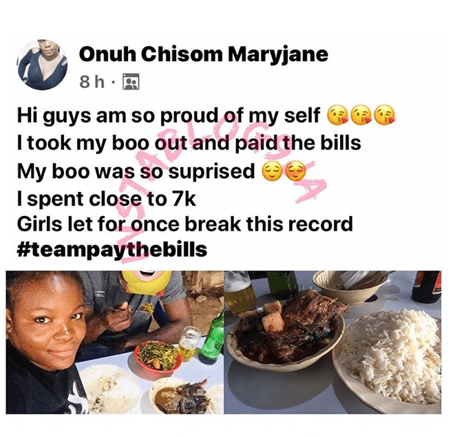 “Hi guys am so proud of myself. I took my boo out and paid the bills. My boo was surprised.I spent close to 7k. Gilrs let for once break the record #teampaythebills” she wrote.