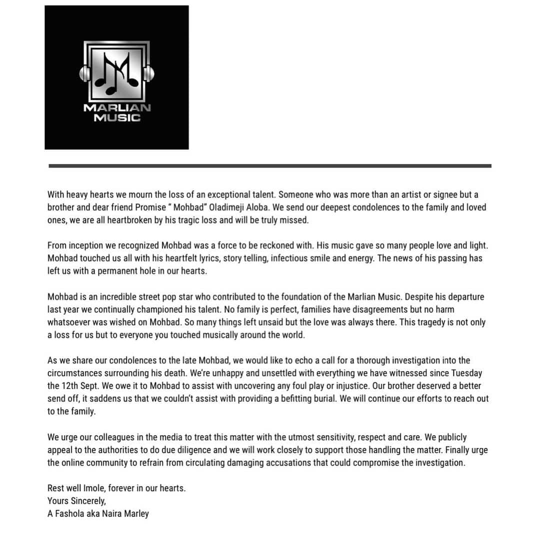 The Chief Executive Officer of Marlian Music label, Naira Marley has taken to his page to mourn the death of Mohbad.