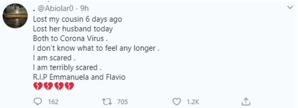 “Lost my cousin 6 days ago Lost her husband today Both to Corona Virus . I don’t know what to feel any longer . I am scared . I am terribly scared . R.I.P Emmanuela and Flavio.”
