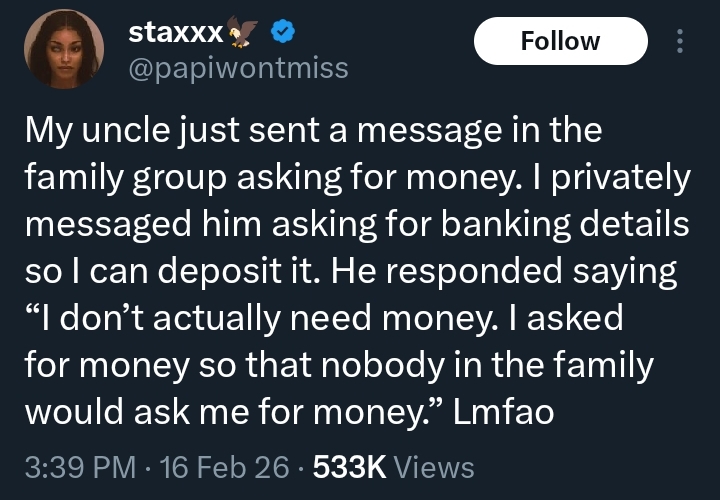 Emavis commented, “I’m crying 😭 that’s actually genius. Man said ‘let me ask first so nobody will ask me.’ That’s advanced family group survival tactics right there. Your uncle is playing chess for real.”