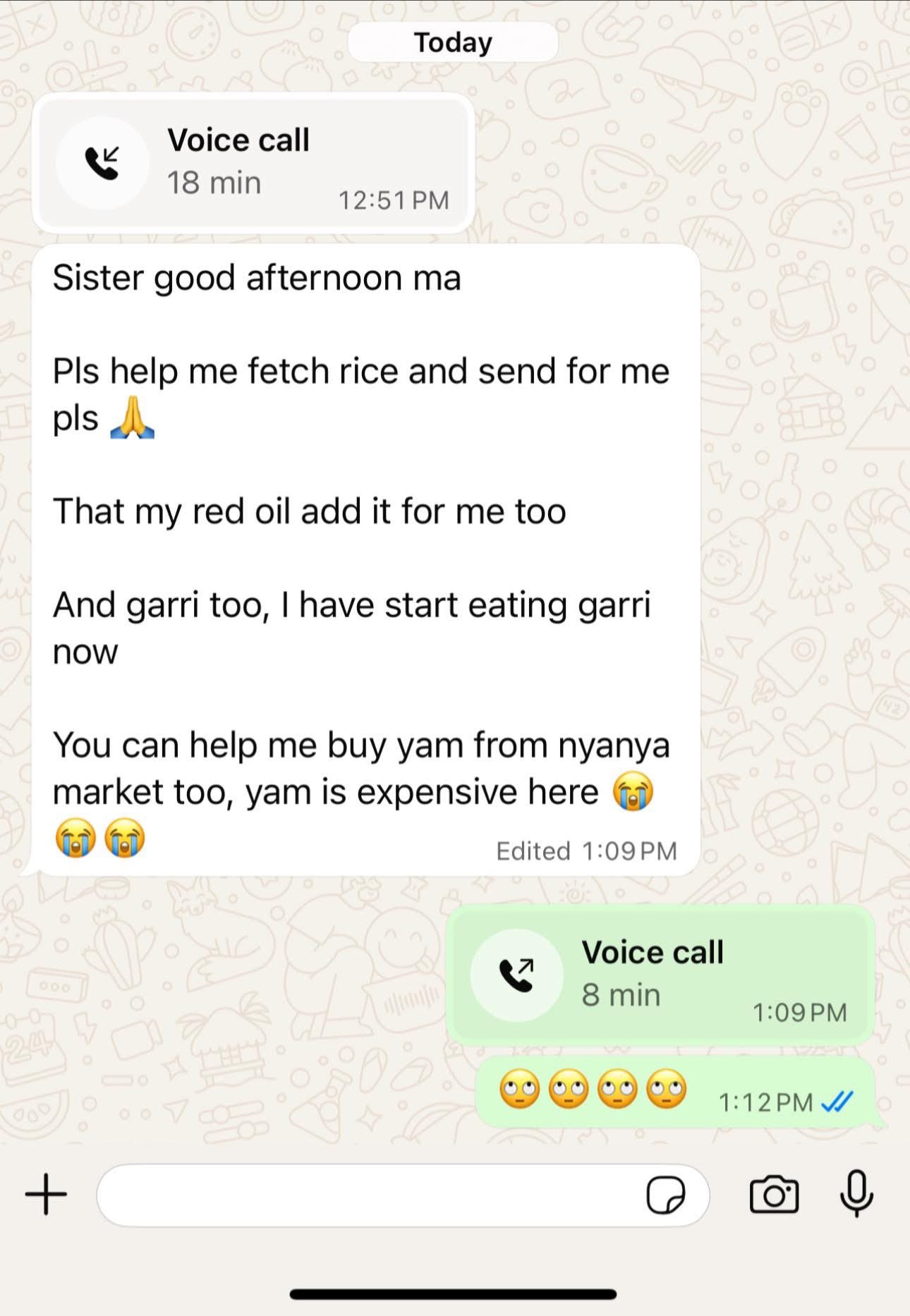 ”Sister, good afternoon ma. Please help me fetch rice and send for me please. That’s my red oil add it for me too and garri too, I’ve started drinking Garri now. You can help me buy yam from nyayan market too, yam is expensive here“, The text reads.