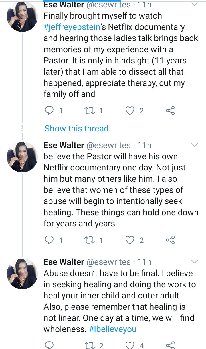 Her post in this regard reads: “Finally brought myself to watch #jeffreyepstein’s Netflix documentary and hearing those ladies talk brings back memories of my experience with a Pastor. It is only in hindsight (11 years later) that I am able to dissect all that happened, appreciate therapy, cut my family off and seek healing off and online but especially online because I have met so many people and read so many stories that make me believe it wasn’t my fault. I was targeted like most young women and shame has kept me small all these years. No more!