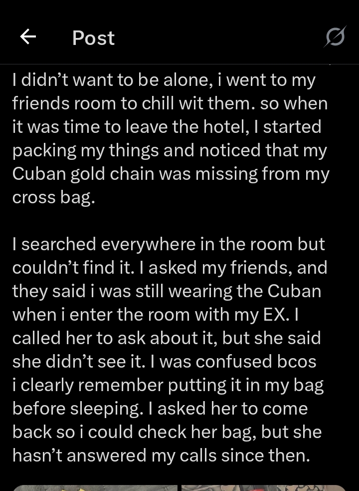 Sharing further details about his missing Cuban gold chain, the X user stated,” I was confused because I clearly remember putting it in my bag before sleeping. I asked her to come back so i could check her bag, but she hasn’t answered my calls since then”.