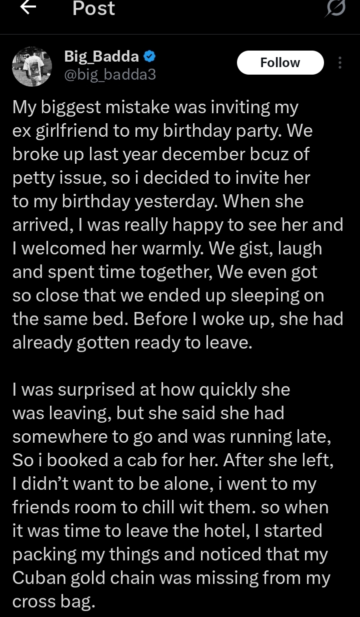 An X user has shared a heartbreaking account of losing his cuban gold chain after inviting his ex-girlfriend to his birthday party.